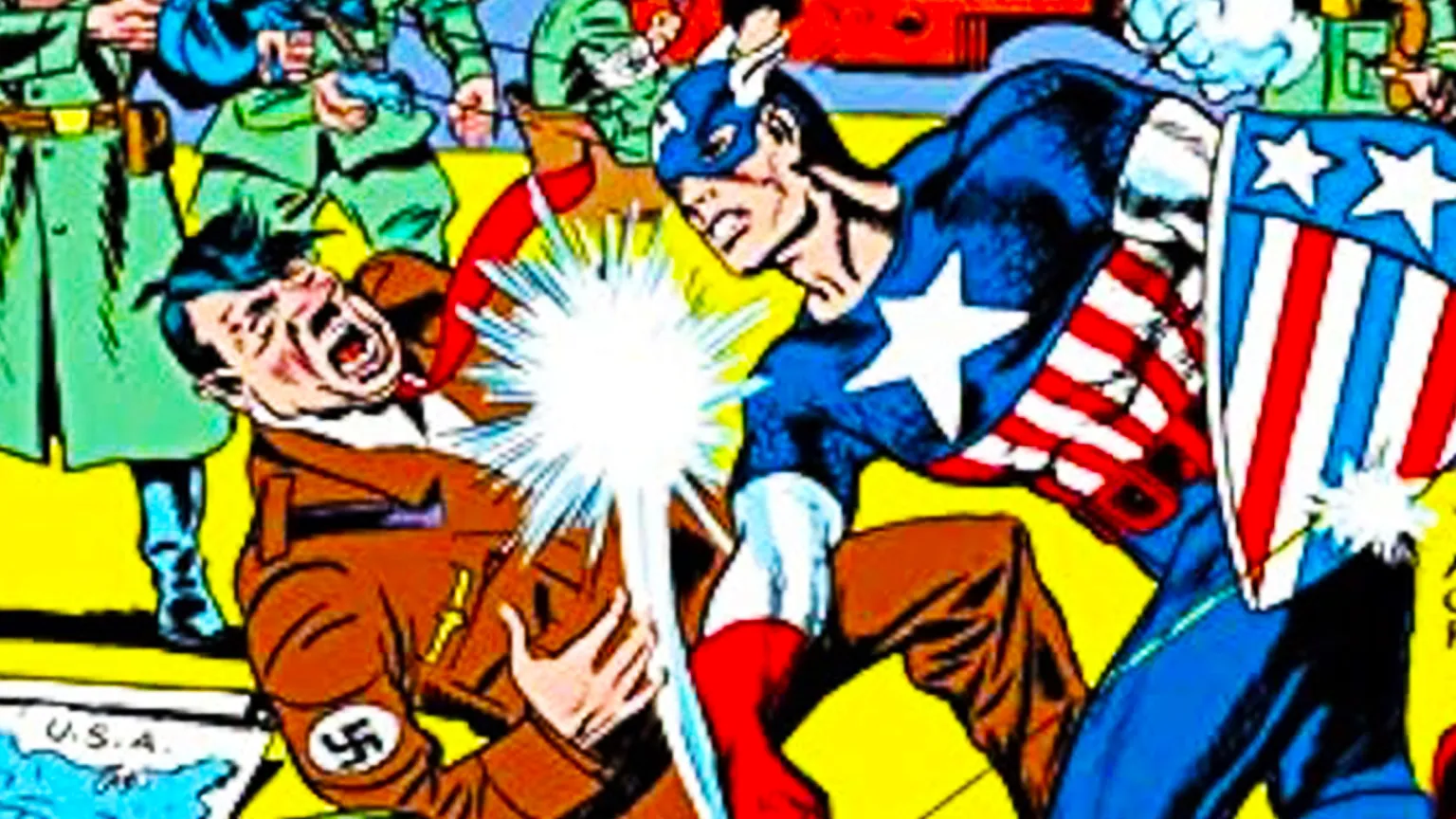L’immagine di Captain America (Steve Rogers) che sferrava un pugno ad Adolf Hitler risale ai primi fumetti del personaggio del 1941. La versione cinematografica del 2011 mostra Cap durante uno spettacolo della USO mentre colpisce un attore travestito da Hitler, rendendo omaggio alle origini patriottiche del supereroe.
