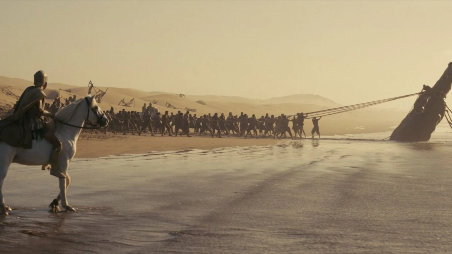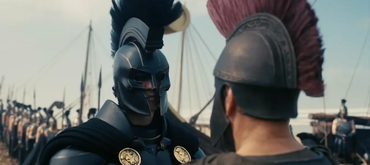 La scelta di aprire il racconto con l’assalto al cavallo di Troia risponde a una logica precisa: la guerra non viene ridotta a semplice cornice mitologica, ma diventa un’esperienza legata alla tensione fisica e a un controllo strategico del silenzio da parte dei soldati nascosti. La macchina da guerra, pensata come “contenitore” di morte, risulta coerente con un impianto visivo e sensoriale pensato per la resa IMAX.