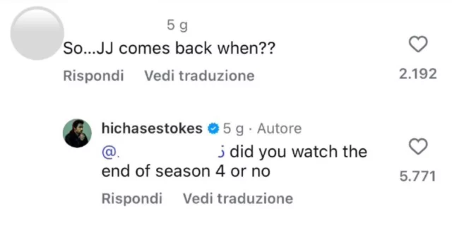 Sui social network, Chase Stokes ha condiviso alcune immagini dal set della nuova stagione. Tra i commenti ricevuti spiccava quello di una fan che chiedeva aggiornamenti sul possibile ritorno di JJ. La replica dell’attore è stata molto diretta: “Hai visto la fine della quarta stagione o no?”, ha scritto con tono ironico e pungente.