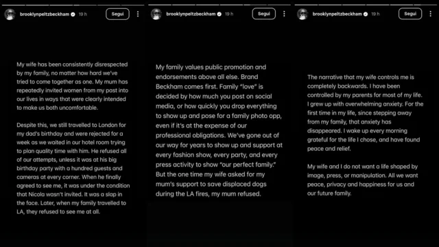 il 19 gennaio 2026 brooklyn peltz-beckham ha pubblicato sul proprio profilo una dichiarazione di sei pagine in cui espone la propria versione dei fatti. tra le frasi più rilevanti compaiono riferimenti a “attacchi incessanti” subiti sia in privato sia sui media. tra le affermazioni più nette, emerge la frase: “non voglio riconciliarmi con la mia famiglia” e “mi sto difendendo per la prima volta nella mia vita”, segnalando una rottura definitiva con una narrazione controllata dai genitori.