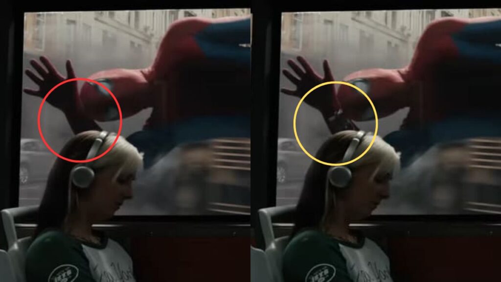 La curiosità nasce da un confronto diretto tra la versione statunitense del teaser e diverse versioni internazionali diffuse tramite canali ufficiali di Sony. Nel filmato divulgato sugli account legati a Spider-Man e Sony Pictures, Peter Parker appare con i classici lancia-ragnatele mentre viene trascinato lungo il fianco di un autobus.
